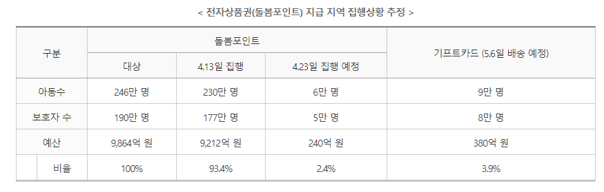 선불카드인 기프트카드 신청이 필요한 약 8만 명(약 3.9%)은 복지로와 주민센터 등에서 신청을 계속 받고 있으며, 5월초 기프트카드를 배송할 계획이다.