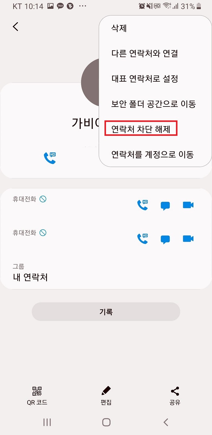 그러면 아래와 같은 팝업메뉴가 보이는데 연락처 차단 해제를 선택하면 해결 됩니다.