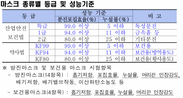 쓸데없는 소리가 길었다. 분진 또는 미스트의 입자가 코나 입,즉 호흡기를 통해 체내에 유입되는 것을 방지하기 위해 사용되는 이것은 우리나라 기준으로 2급/1급/특급, 미국 기준으로는 N95, R95, P05등의 등급이 있고 EU기준으론 FFP1, FFP2, FFP3등이 있다고 한다. 우리나라 가준을 좀 더 들여다보자. 방진마스크는 노동부 고시 제2014-46호에 따라 다음과 같은 기준을 따른다. 특급 같은 경우는 베릴륨과 같이 독성이 강한 물질을 함유한 분진 등의 발생장소, 석면취급장소 일 경우 1급은 특급을 제외한 분진 발생장소, 열적으로 생기는 분진 장소, 기계적으로 생기는 분진 등의 발생장소 2급은 특급 및 1급 마스크 착용 장소를 제외한 분진 발생장소이다. 특히 특급과 1급 마스크는 배기밸브가 반드시 달려 있어야 한다. 약사법에 따른 마스크 등급은 KF99, KF94, KF80 등이 있다. 우리에게 너무 익숙한 마스크의 'KF'란 korea filter의 약자이다 식약처 인증 '의약외품' KF 기준은 방진마스크처럼 안면부 밀착력까지 간섭하지 않는다. 또 방진 등급 검증절차에 비해 덜 까다롭다. 그만큼 제조 업체나 디자인이 엄청 다양하다.