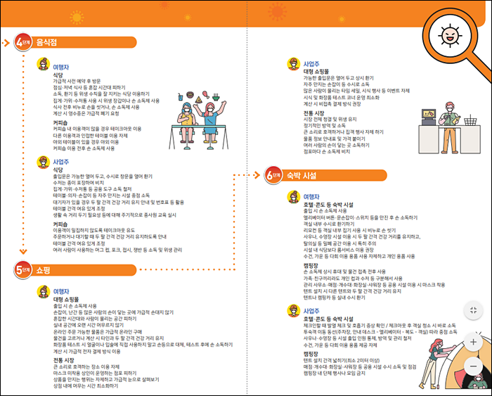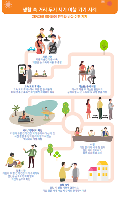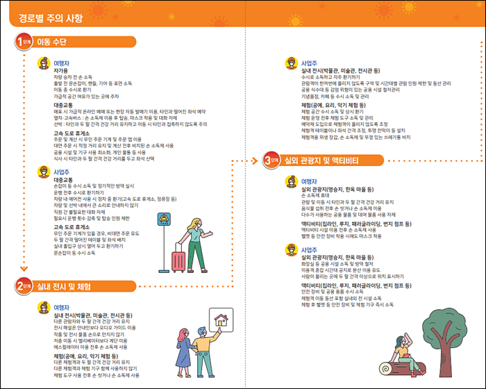 최소한의 간격유지를 목표로(2m,최소 1m), 마스크를 착용하며, 이동 시마다 소독 등을 통해 안전한 여행 모델을 만든다고도 합니다.