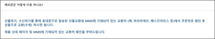 선물하기,수신하기등 휴대폰으로 발송된 선물교환권에 기재되어 있는 교환처에서 쿠폰번호 확인을 통해