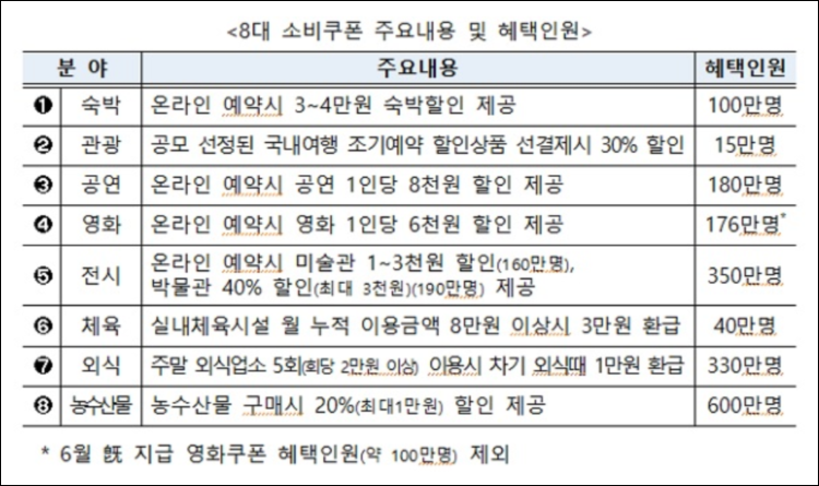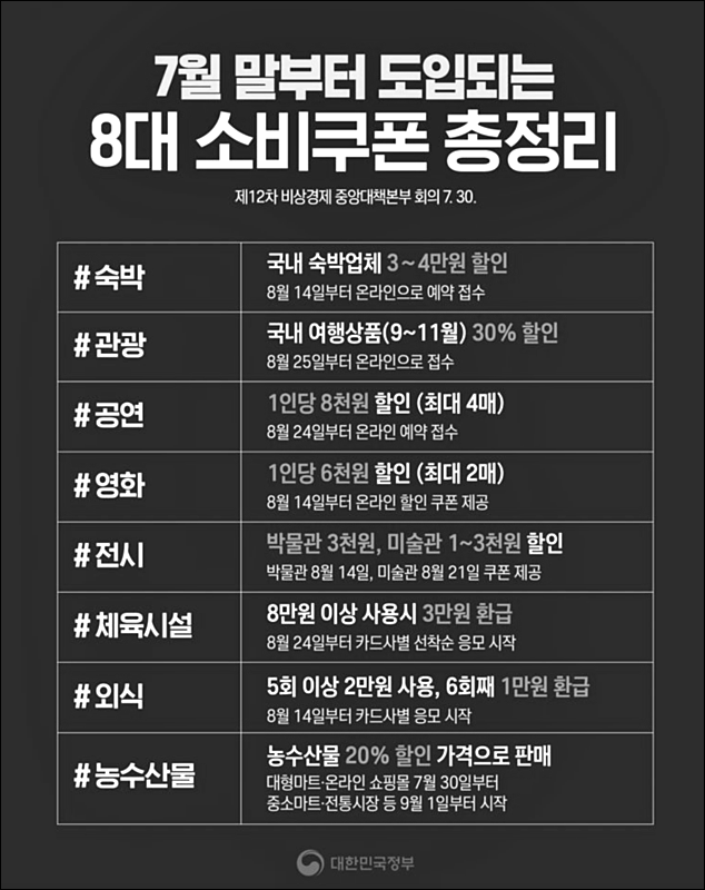 8대 쿠폰은 이달 말부터 순차적으로 시행하되 국민 휴식을 지원하기 위한 외식·영화·전시 등 쿠폰은 8월 17일 임시공휴일 전후로 제공할 계획이다.
