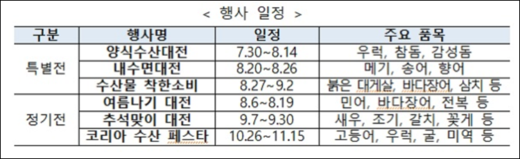 하계휴가(8월), 추석 연휴(9월), 코리아세일페스타(11월) 기간에 맞춰 ‘대한민국 찐 수산대전’을 총 6회 진행한다.