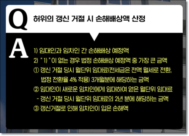 Q. 허위의 갱신 거절 시 손해배상액 산정 A. 1) 임대인과 임차인 간 손해배상 예정액 2) “1) ” 이 없는 경우 법정 손해배상 예정액 중 가장 큰 금액 ① 갱신 거절 당시 월단위 임대료(전세금은 전액 월세로 전환, 법정 전환율 4% 적용) 3개월분에 해당하는 금액 ② 임대인이 새로운 임차인에게 임대하여 얻은 월단위 임대료 - 갱신 거절 당시 월단위 임대료의 2년분에 해당하는 금액 ③ 갱신거절로 인해 임차인이 입은 손해액 Q. 법 시행 이후 계약기간이 만료되어 새로운 세입자와 계약을 했는데, 기존세입자가계약갱신을 요구할 수 있나요?