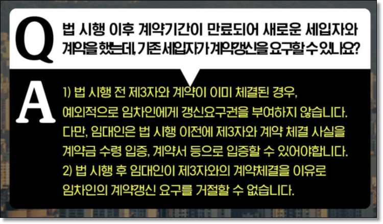 A. 1) 법 시행 전 제3자와 계약이 이미 체결된 경우, 예외적으로 임차인에게 갱신요구권을 부여하지 않습니다. 다만, 임대인은 법 시행 이전에 제3자와 계약 체결 사실을 계약금 수령 입증, 계약서 등으로 입증할 수 있어야 합니다. 2) 법 시행 후 임대인이 제3자와의 계약체결을 이유로 임차인의 계약갱신 요구를 거절할 수 없습니다.