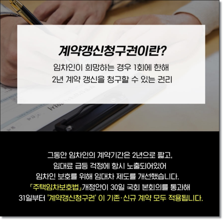 「주택임차보호법」개정안이 30일 국회 본회의를 통과해 31일부터 ‘계약갱신청구권’이 기존·신규 계약 모두 적용됩니다.