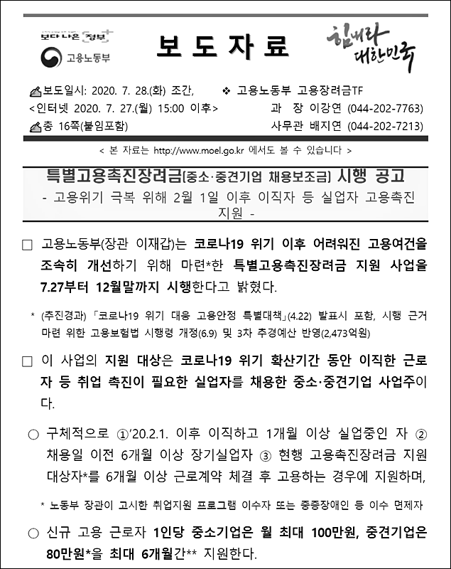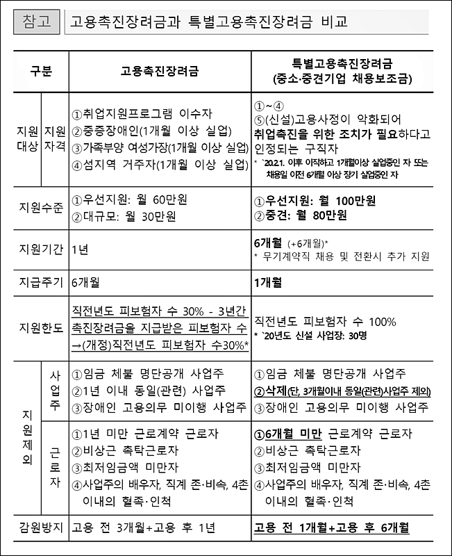 2020년 2월 퇴사후 한달 이상 실업중인 분들과 채용전 6개월 이상 실업자에 대해서도 특별고용촉진장려금을 신청할 수 있다고하네요 그전에는 기존 지원대상인 취업지원프로그램 이수자,중증 장애인,가족부양 여성 가장, 섬지역 거주자에 한해 지원이 되었다 합니다.