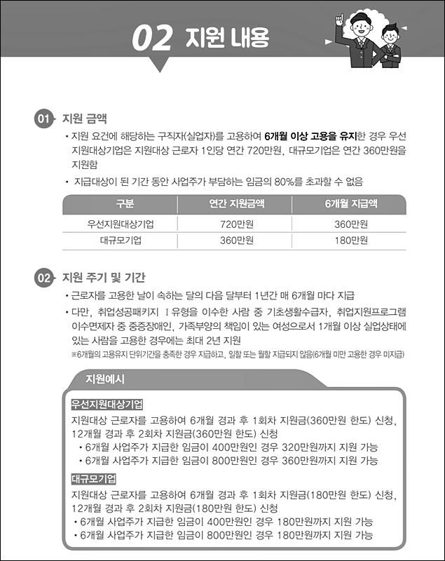 새롭게 채용한 직원 1명당 최대 6개월간 우선지원 월 최대 100만원을 지원하고, 중견기업은 월 최대 80만원을 지원합니다.