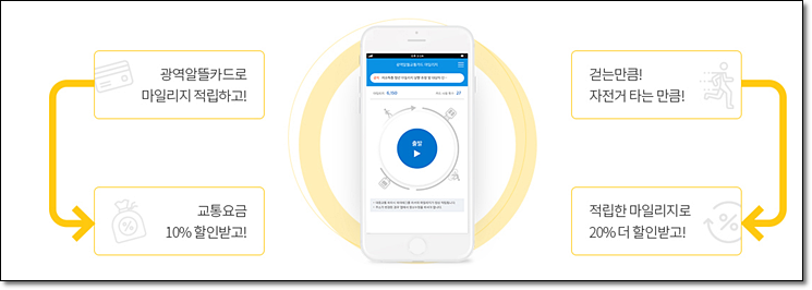 대중교통을 이용하기 위해 걷거나 자전거로 이동한 거리만큼 마일리지를 적립하여 지급하고, 아울러 카드사의 추가할인 혜택을 포함하여 대중교통비를 최대 30%까지 절감할 수 있는 교통카드