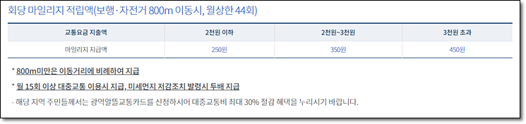 대중교통을 이용할 때 걷거나 자전거등을 이용해서 움직인 거리 만큼 마일리지를 최대 20%지급하고 카드사가 또 10%를 추가할인하여 최대 30%까지 교통비를 절약할 수 있다고 하네요. 일반버스를 이용한다면 월 최대 1만원이상의 마일리지가 쌓이고, 광역버스 이용자의 경우는 더 큰 혜택이 돌아간다고 하네요( 약 1만9천800원 가량)