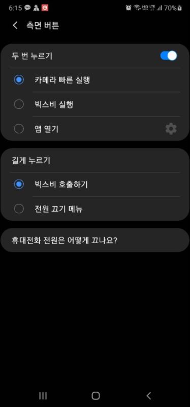 보시는대로 두번 누르면 카메라가, 한번 누르면 빅스비 호출로 되어 있는걸 저는 전원 끄기 메뉴로 바꿔 설정해 놓고