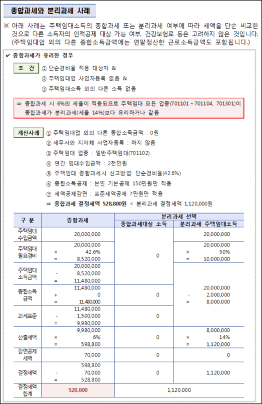 - 주택임대 수입금액이 2천만 원 이하인 경우 주택임대소득은 종합과세(세율 6~42%)와 분리과세(세율 14%) 중 선택 가능합니다.