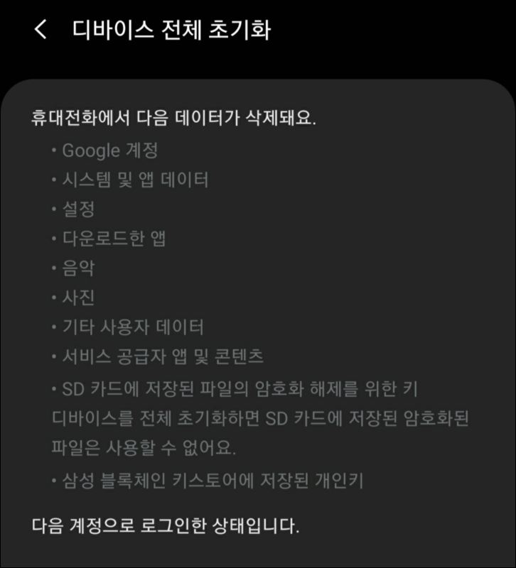 구글 계정뿐만 아니라 지금까지 설치했던 어플 정보, 설정 정보, 기타 사용자 데이터가 모두 삭제되어
