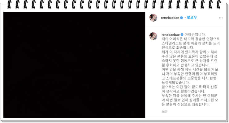 아이린 인스타 사과문 전문 에디터 저격 인스타