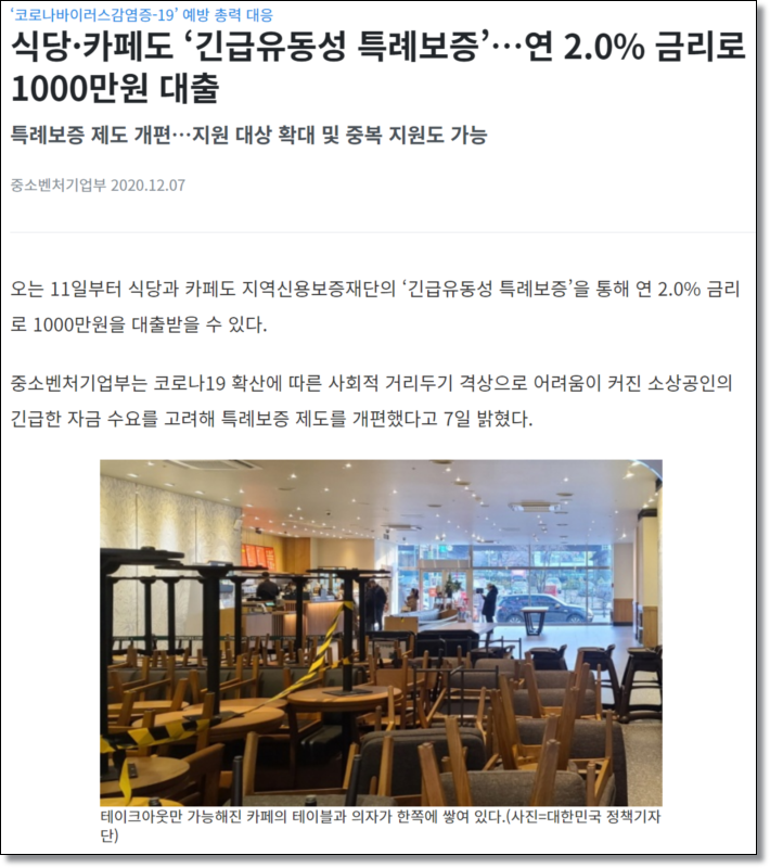 기사에 따르면 중소벤처기업부에서 요즘 같이 어려운 상황을 직면한 소상공인을 위해 자금수요에 보다 숨통을 트여줄