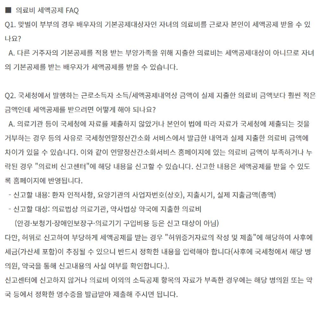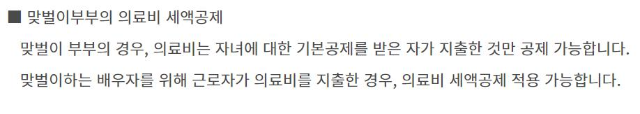 다시 말해 맞벌이 부부의 경우, 의료비는 자녀에 대한 기본공제를 받는 사람이 지출한 것만 공제가 가능하다는 점 기억하셔야 할 것입니다.
