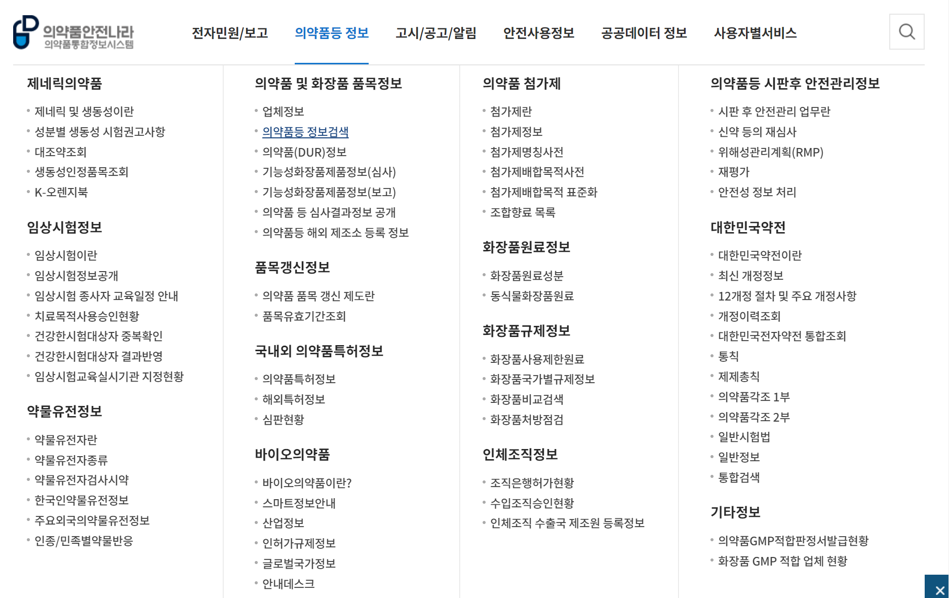 사이트 첫화면에 메뉴에서 "의약품등 정보" 를 클릭하면 아래와 같이 세부 메뉴들이 보이는데요. 거기서