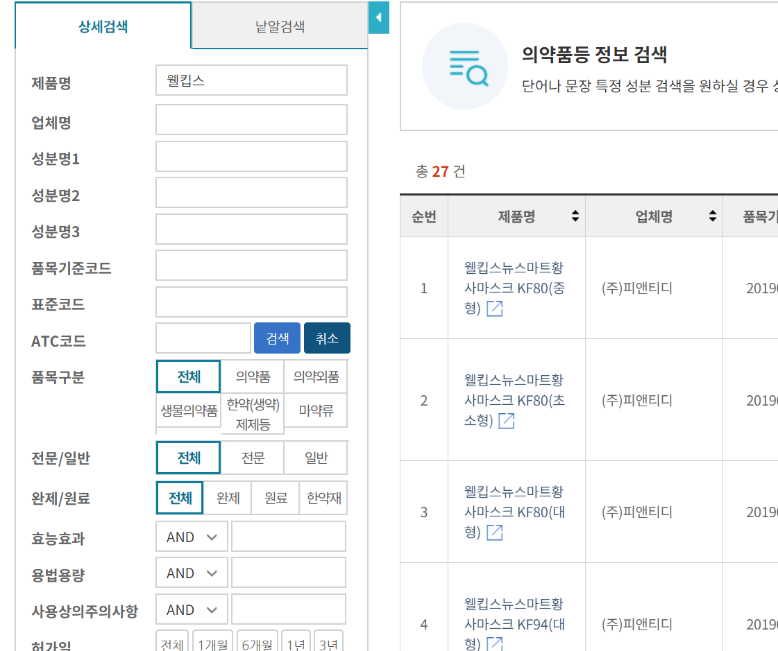 전체로 검색하시고 싶으시면 품목구분에 의약외품 선택하시고 분류번호에서 [32200]보건용마스크를 선택하면