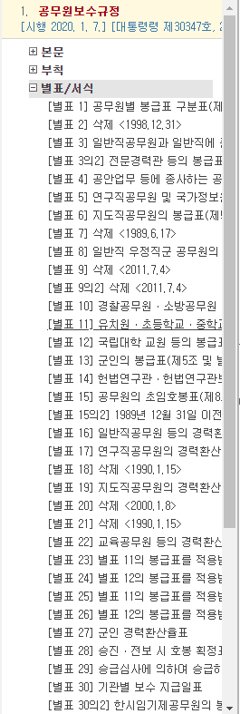 왼쪽에 보시면 본문,부칙,별표/서식이라고 메뉴가 보이는데요. 초등학교, 중학교, 고등학교 교사 봉급표는 "별표 11"입니다