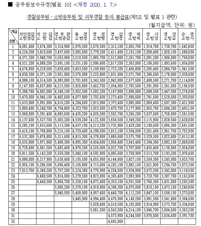 제가 가장 궁금했던 자료도 찾아봤는데요. 그건 경찰공무원, 소방공무원 및 의무경찰 봉급표입니다. 아래와 같아요.
