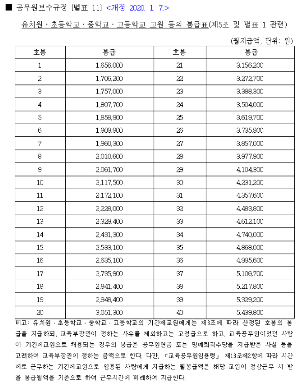 2020년 초등학교,중학교,고등학교 교원 봉급표. 국가법령정보센터에서 찾아보자. 선생님 월급,소방공무원 월급