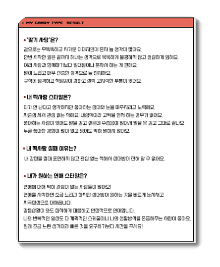 12가지의 항목을 다 고르고 나니 저는 딸기 사탕이라고 하는군요. 좋아하면서도 관심없는 척하는. 감정표현보다는 질문으로 상대방을 알아가는 것이 딸기사탕이라고 하네요.