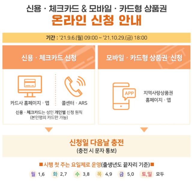 지원금 온라인 신청의 경우 신청일 다음날 충전되니 꼬옥 확인하실길 바랍니다. 신청시 주의 사항으로는 시행 첫주의 경우 요일제로 운영된다는 점 참고하시기 바랍니다.