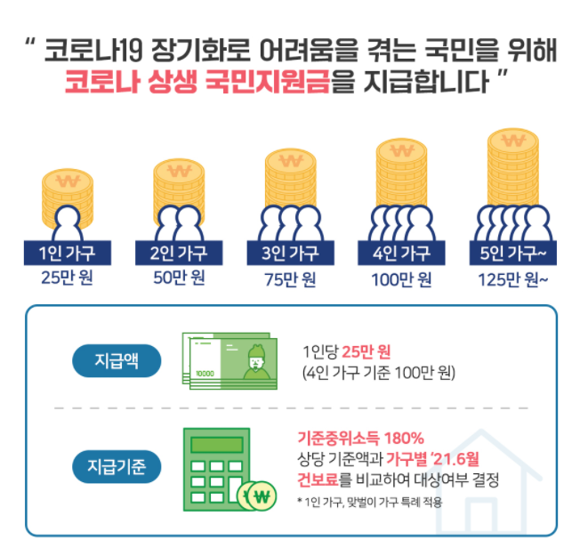 5차 재난 지원금의 지원 규모는 1인당 25만원입니다. 이는 건강보험료를 기준으로 가구별 합산액이 기준액보다 낮은경우 대상으로 정해진다고 하는데요. 1인가구와 맞벌이 가구의 경우는 특례를 적용한다고 하니 아래 정보를 참고 하시기 바랍니다.