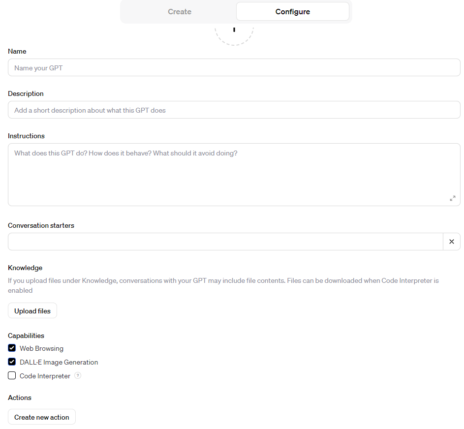 GPT Builder를 통해 생성하는 법과 configure에 직접 세팅값을 작성해 만드는 방법이 있습니다.