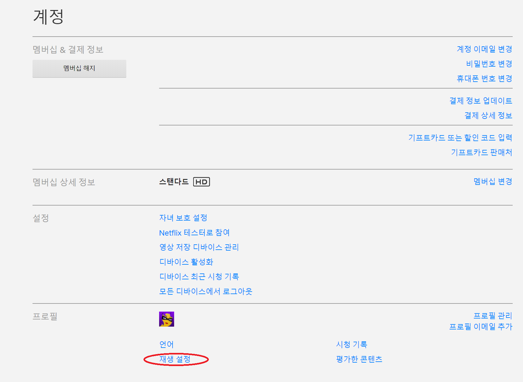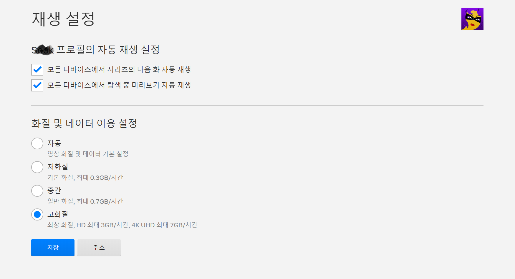 재생설정은 프로필별로 따로 해야 합니다. 한 아이디로 복수시청이 가능하니 각각 설정해야하는 건 호불호가 있겠네요.