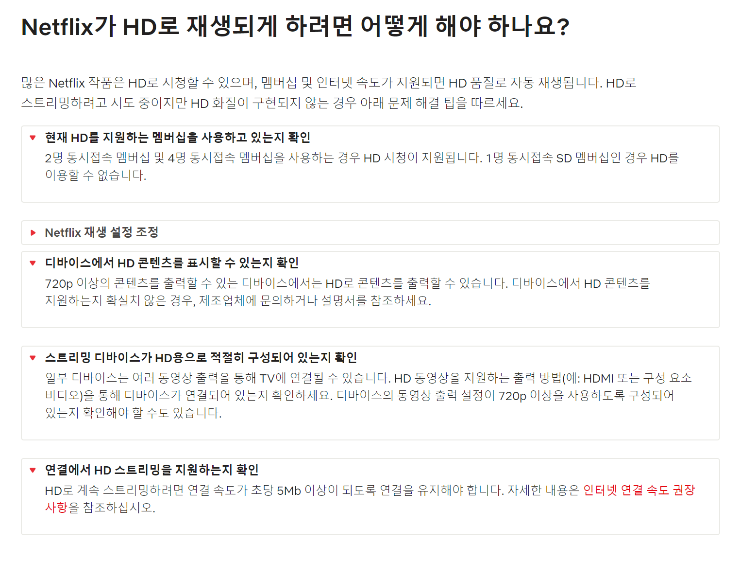 먼저 NETFLIX에서 안내하는 것처럼 HD 를 지원하는 멤버십 여부를 확인해주세요.