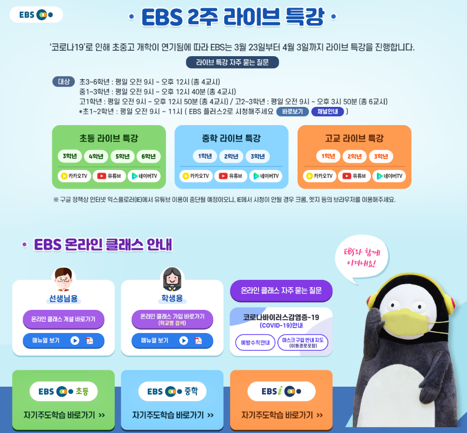 초등 1.2학년 교안은 EBS초등 공지사항에서 다운로드 가능합니다.(초등 1학년은 1주차에는 교안없이 수업이 진행됩니다.)