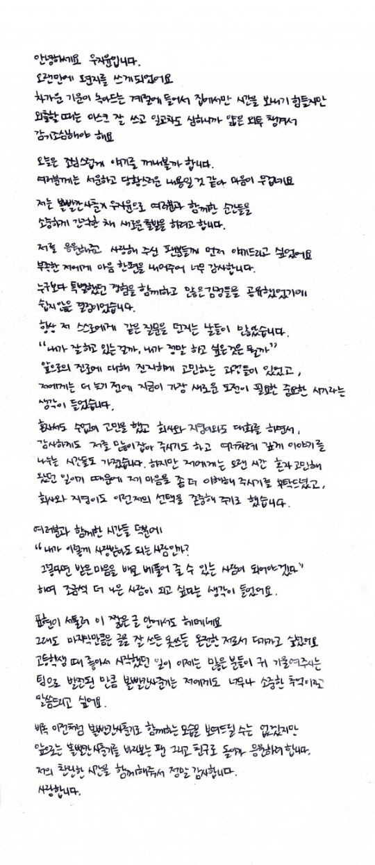 아래는 우지윤님 탈퇴에 따른 자필 편지라고 해요.