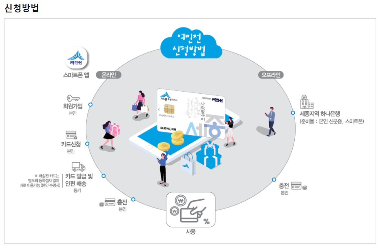 (방법 2) 세종지역 하나은행을 방문하면 여민전 앱 설치, 회원가입, 카드신청 등 도움을 받을 수 있습니다.