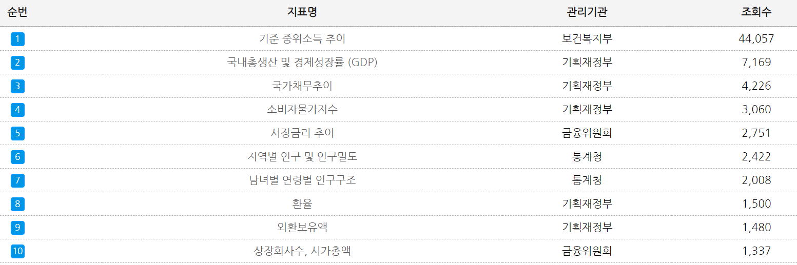 그 밖에도 국내 총인구, 국내총생산,경제 성장률,월별 소비자물가 등 핫한 정보들을 쉽게 접할 수 있습니다.