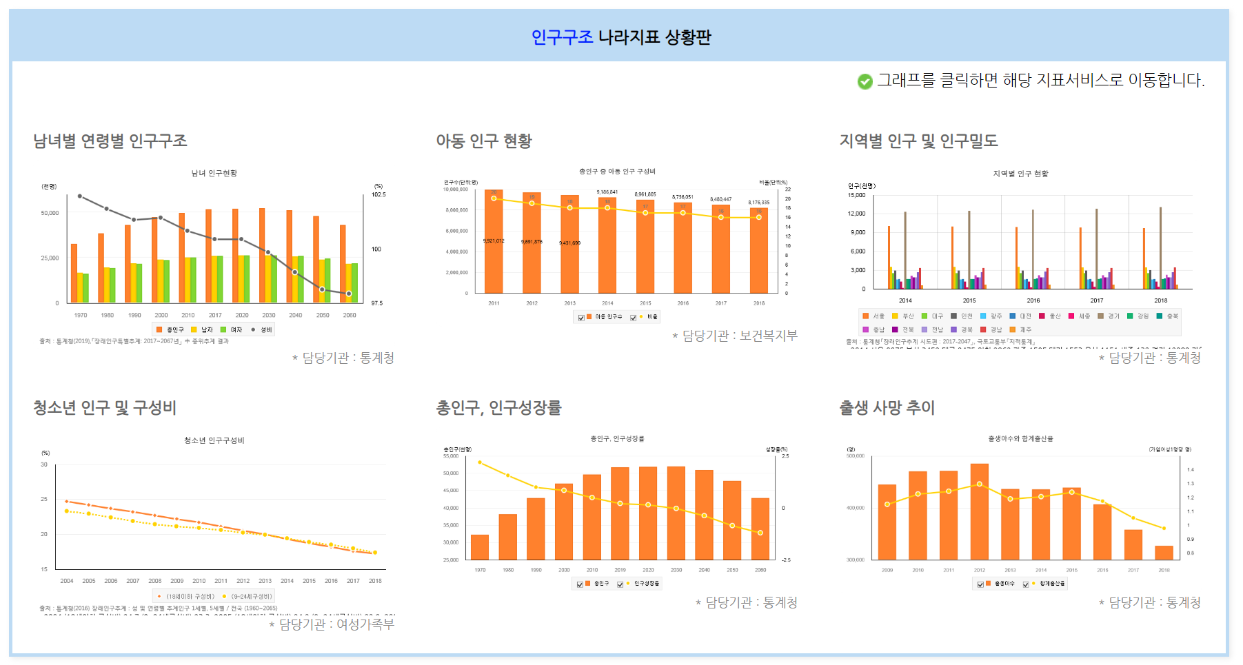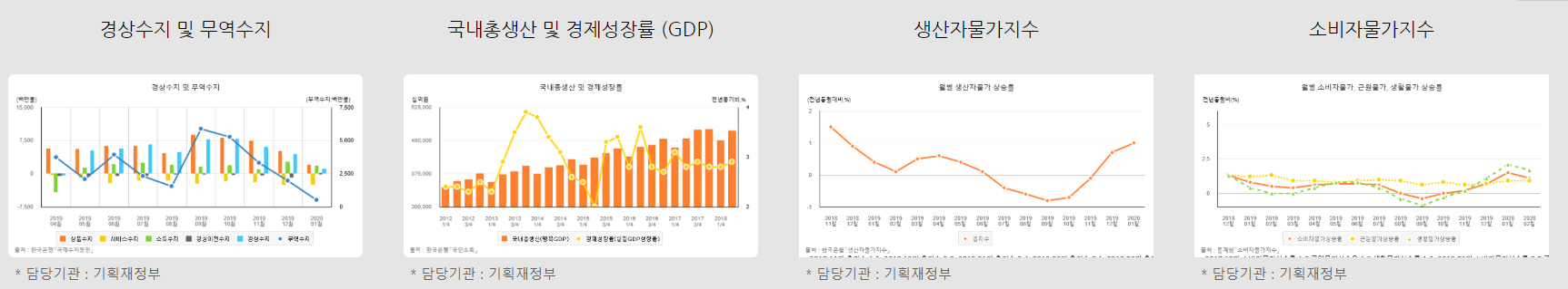 그 밖에도 국내 총인구, 국내총생산,경제 성장률,월별 소비자물가 등 핫한 정보들을 쉽게 접할 수 있습니다.